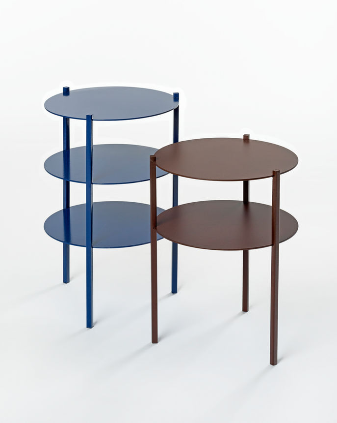 Mesa lateral com estrutura e tampo em aço e pintura eletrostática, com duas opções de altura.